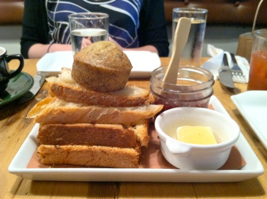 This is where the story takes a turn for the surprisingly pleasant. Instead of getting a few mundane slices of bread, you get a carbohydrate ziggurat, capped with a warm banana muffin. Everything here is as it should be. The brioche is Texas toast thick, perfect for jamming yet thankfully not desiccated. The muffin is not over-sweet and tastes clearly but not forcefully of bananas. The country toast is, well, country toast.